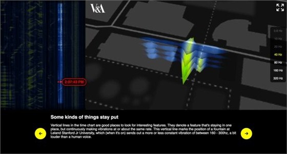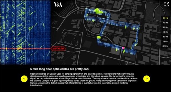 這種可視化,即“Big Glass Microphone”能夠在十分鐘以內(nèi)把電纜中的數(shù)據(jù)提取出來,這些電纜以傾斜向一邊的8字形狀埋在地下6英寸深處。從可視化數(shù)據(jù)圖中,我們很容易可以看到三種不同程度的振動波動,分別是汽車、大型噴泉和自行車行人造成的波動。受全球最大裝飾和設計藝術館維多利亞和阿爾伯特博物館(Victoria and Albert Museum)的委托,這項可視化工程將會于2018年在館內(nèi)展示。